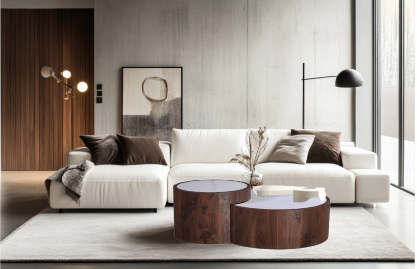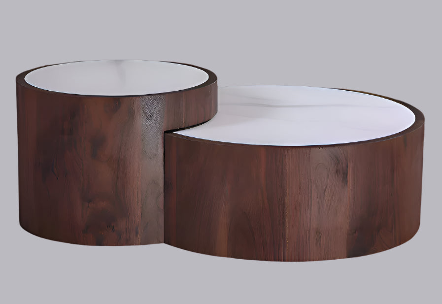 Juego de 2 mesas de centro redondas nogal y piedra sinterizada Scott